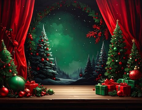 A festive Christmas scene unfolds behind a backdrop of rich red velvet curtains, showcasing Christmas trees adorned with vibrant red and green ornaments, and gifts arranged on a rustic wooden table.