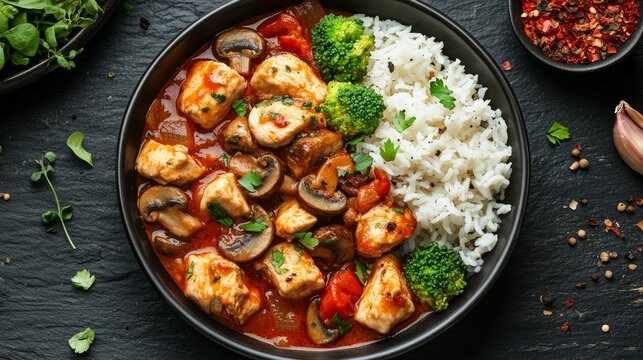 This appetising dish with chicken, rice and vegetables in sauce will make an attractive backdrop for culinary blogs and healthy eating advertisements.