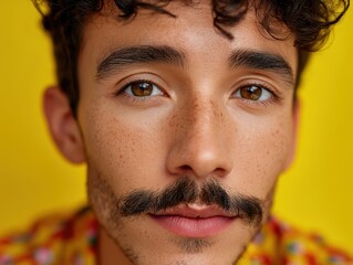 Young man with stylish curly hair and sharp jawline. Profile view shows modern fade haircut and expressive facial features on neutral backdrop. Clean skin, light beard stubble detail.