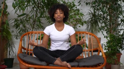 Cheerful African-American young woman opening eyes after meditation practice and begin to dance sitting in lotus pose on couch, in home living room with biophilic interior. Shooting in slow motion.
