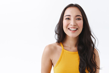 Outgoing, joyful good-looking young modern east-asian woman in yellow top, laughing carefree, smiling and gazing camera happy, making cheerful expression as enjoy nice friendly atmosphere