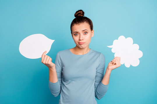Portrait of her she nice attractive lovely doubtful girl holding in hands two boards copy empty blank space isolated over bright vivid shine turquoise background