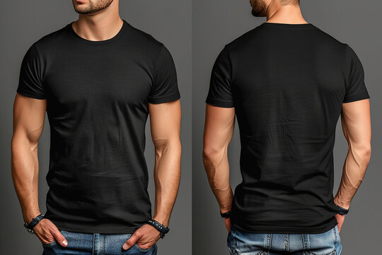 T-shirt mockup, Black blank t-shirt front and back views, male clothes wearing clear attractive apparel tshirt models template сreated with Generative Ai