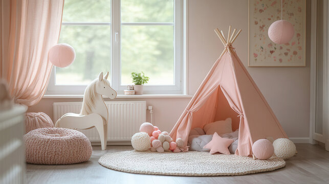 Corner children's room beautifully decorated teepee play tent and round rug glowing fairy lights and play tent background, creating dreamy nighttime atmosphere.