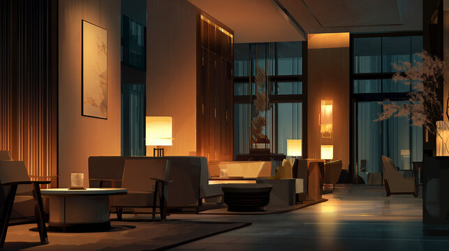 間接照明が美しく映える洗練された高級ホテルラウンジの夜景イラスト