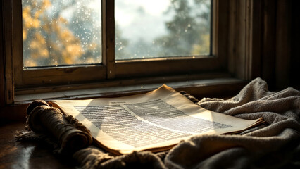 Open torah scroll illuminated by sunlight streaming through window on shemini atzeret, evoking a sense of reverence and tradition