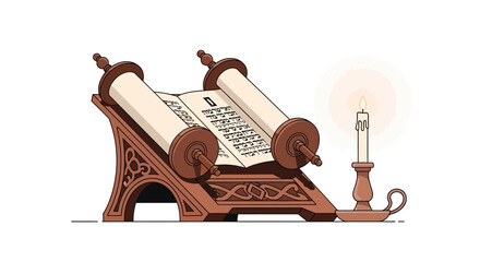 An illustrated Jewish Torah scroll unrolled on a decorative wooden stand beside a lit candle.
