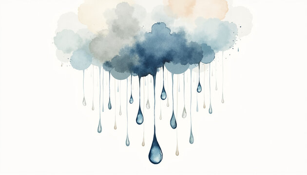 Watercolor raindrop falling from cloud, symbol of nature and renewal