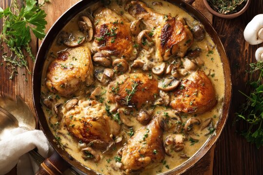 Close up shot of Alsace Coq au vin chicken cooked in white wine cream and mushrooms in a saucepan viewed from above