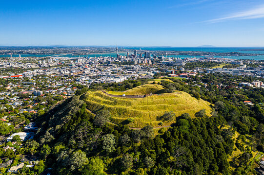 Aerial view of Mount Eden, Sacred Maori site, Auckland, New Zealand.