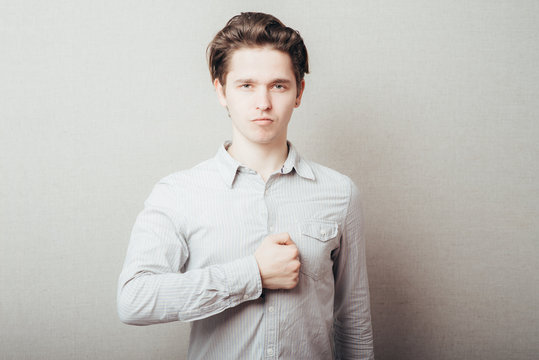 Young handsome man is swearing allegiance with his hand, fist on chest. Closeup portrait arrogant, self important, stuck up, napoleon complex, short man syndrome guy Emotion facial expression feeling