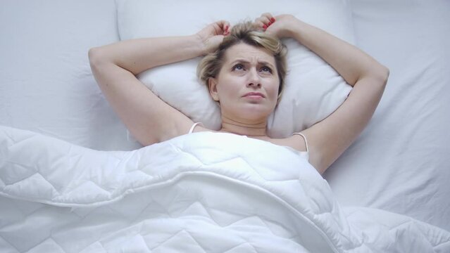 Lazy restless woman waking up early in morning in her day off because of loud neighbours, poor soundproofing and good audibility of house