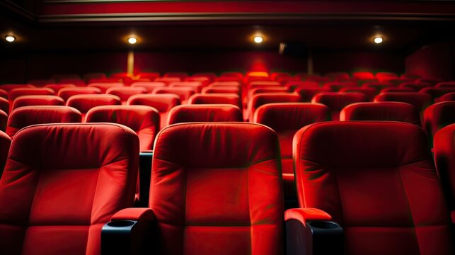 Rows of vibrant red cinema seats in dim, moody lighting, creating a sense of anticipation in an empty theater.