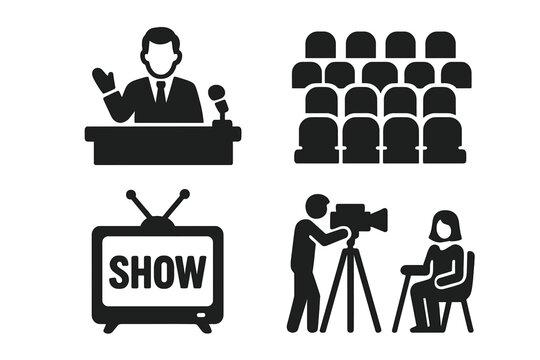 TV talk show icons set. Host at podium, studio audience seats, television show logo, cameraman filming guest. Broadcast, interview, recording, media, journalism, communication concept vector