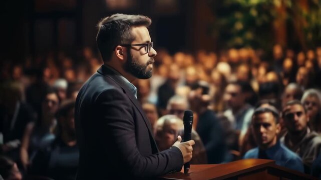 speaker in front of the audience back view, debate, male lecturer speaking in front of a hall of people, the concept of public speaking abstract fictional