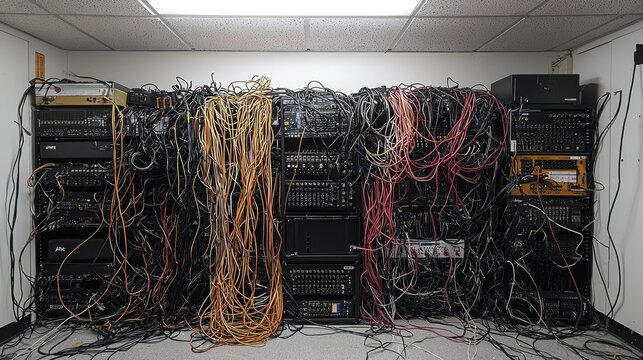 A tangled mess of audio equipment and cables fills a room