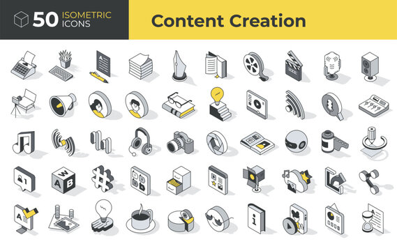 Content creation. Set of isometric icons. Symbols of generating ideas, producing and distributing various forms of media content with focus on writing, blogging, photography, learning, marketing