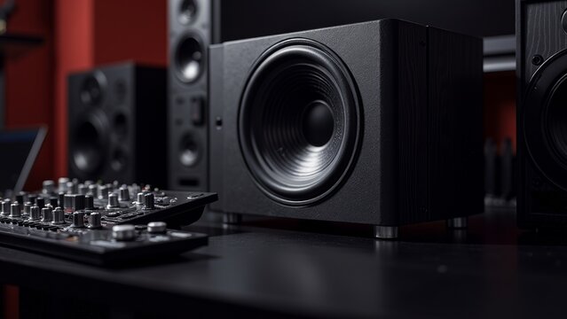 Modern Music Record Studio Control Desk with Laptop Screen Showing User Interface of Digital Audio Workstation Software. Equalizer, Mixer and Professional Equipment. Faders, Sliders. Record. Close-up