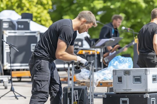 Analog and digital mixing consoles wireless microphone receivers and a sound engineer s hand at a soundcheck for an outdoor music festival featuring selective focus and shallow depth of field