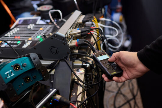 Close-up view of audio mixing console with cables connected during a live event setup process