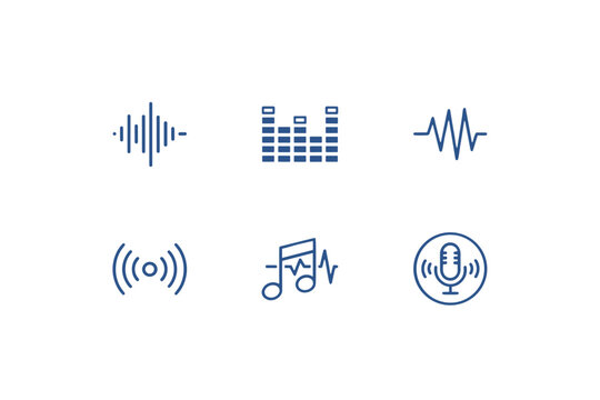 Audio button thin line icon set. Containing music, sound, speaker volume, play, video, pause, equalizer, loudspeaker, mute, microphone, headset. Vector illustration