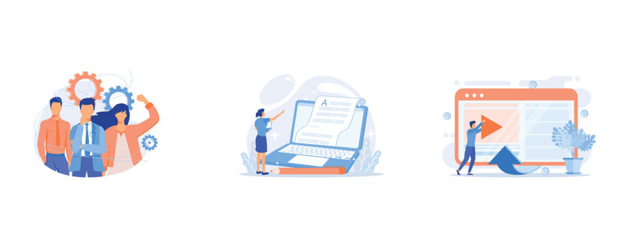 The concept of listening to audio books, studying tutorials, a digital library. Set of 3 vector flat illustrations on a white background. Young men and women read and listen to books, download online.