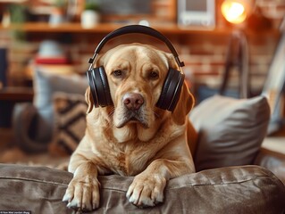 Focused listening in warm ambiance holding headphones