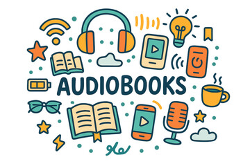 Colorful Audiobook Doodle. Audiobooks. Hand-drawn doodle illustration of Audiobooks. Headphones, e-reader
