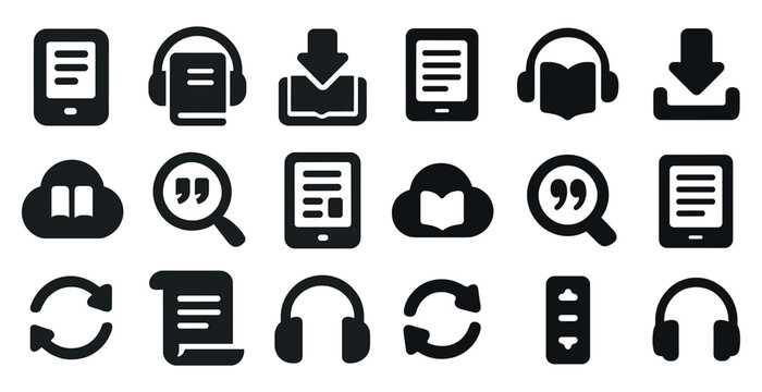 Audiobooks and e-reading solid icons set – filled, book, listening visuals