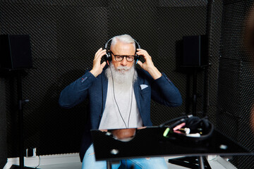 Senior man in headphones during audiology test