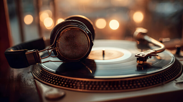 Close-Up of Vintage Headphones on a Turntable with Warm Golden Lighting