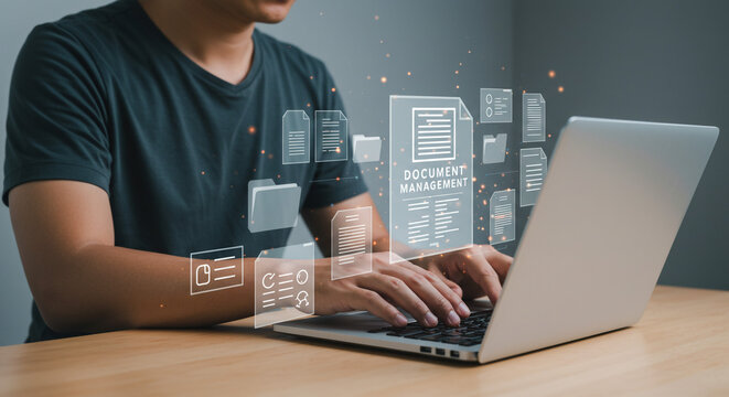 Streamline Document Management Person efficiently manages digital files on laptop with seamless