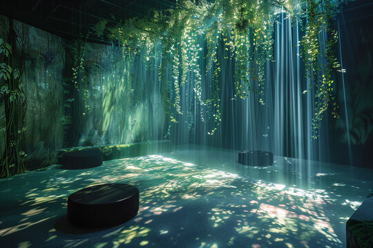 Chic Avant Art Gallery design with innovative sound and light installations in a serene, nature-inspired environment, blending auditory and visual creativity for a multisensory experience,