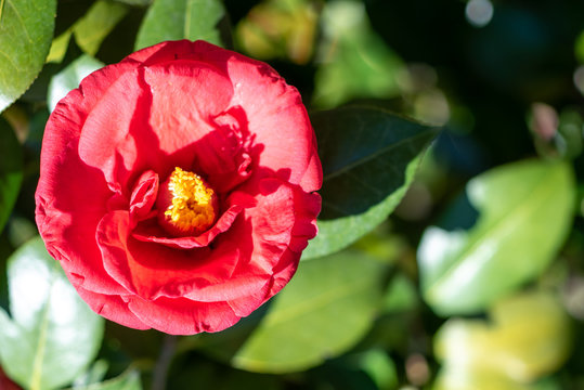 pink Camellia japonica 'Adolphe Audusson' flower blossoming in a lush garden during springtime