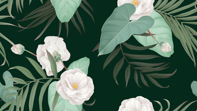 Floral seamless pattern, white Semi-double Camellia flowers with various leaves on dark green