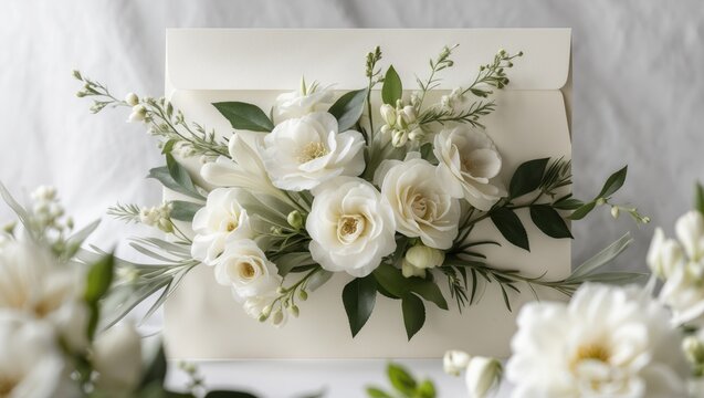 Floral wedding invitation card template design, featuring white flowers with leaves.