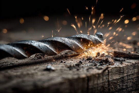 Metal drill bit drilling into wood with sparks flying, close-up. Perfect for industrial, construction, and DIY themes in your design.