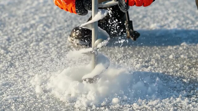 A person drills a hole for ice fishing with an auger in slow motion. Close-up of an ice drill boring through a frozen, snow-covered lake. Winter outdoor activity
