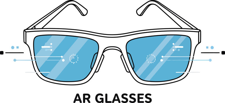 A concept illustration of augmented reality smart glasses with a digital heads-up display on the lenses, isolated on a white background.