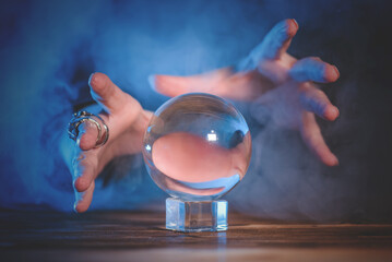Fortune teller is reading the future by a crystal ball on the table in the smoke.