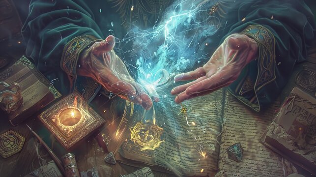 Close-up of a wizard's hands casting a complex spell, magical energy crackling, surrounded by ancient artifacts and scrolls, intricate details showcasing mastery over arcane arts, D&D map inspiration