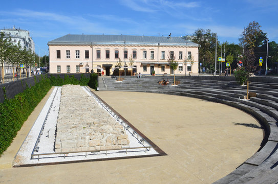 Moscow, Russia, August, 12, 2018.      Fragment of the base of the fortress walls of White city of the 16th century in Moscow