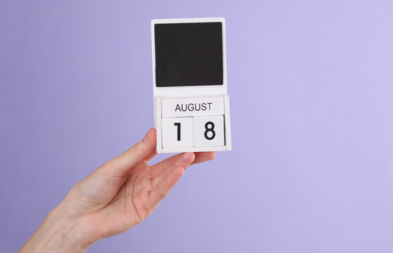 Woman's hand holds wooden calendar with date august 18 on pastel purple background