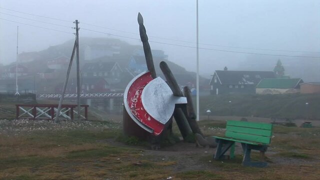 Paamiut, city in Greenland. Old bridge of the city in the background, and a playground shaped as a ulu. It was a foggy day. Filmed in 2009 august 19.