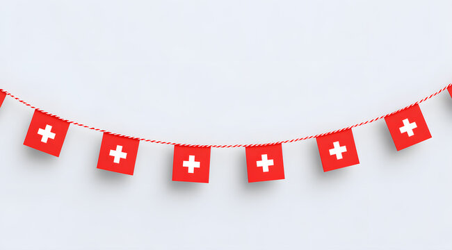 Bunting garland with Swiss flags on white background. A bright and playful decoration for Swiss National Day, perfect for parties and patriotic visuals.