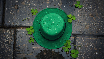 St Patrick’s Day Green Hat and Clover on Wet City Pavement