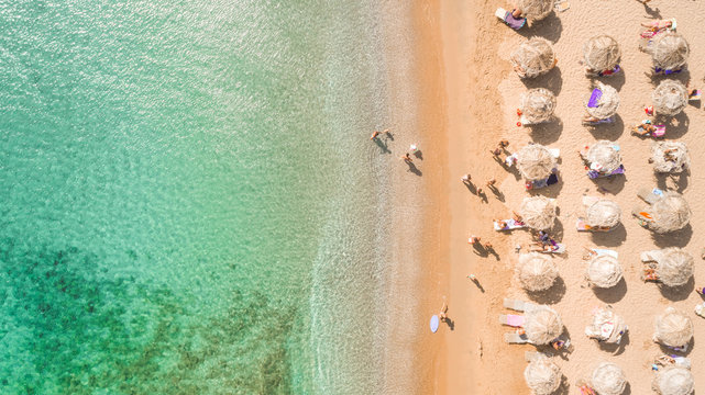 ANDROS ISLAND , GREECE - 27 August 2017 : Aerial photography of people on the beach of Kipri on Andros Island in Greece.