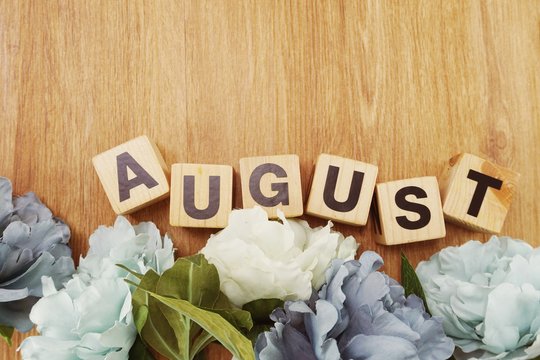 august alphabet letter wooden cube with space copy on wooden background and flower decoration
