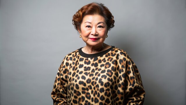 Osaka's auntie wearing a stylish leopard print sweatshirt isolated on background , fashion, trendy, auntie, Osaka, leopard print