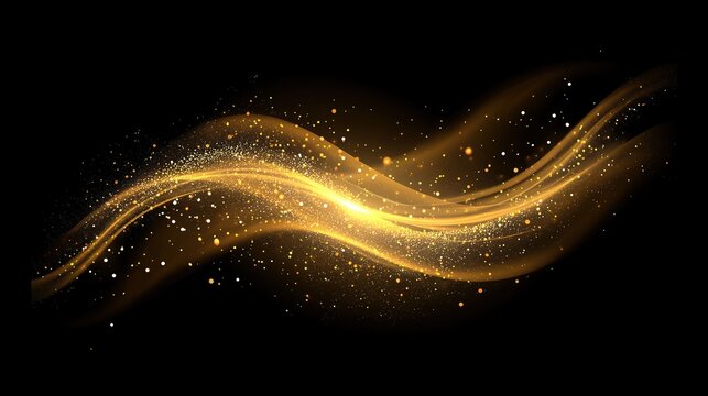 Luxurious golden glitter waves with glowing particles and sparkling stardust trails on a black background, abstract shimmering light design with luminous star effects for elegant and premium backgroun